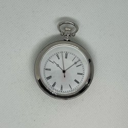 Hänge klocka med vit urtavla och blå visare. Klockan har en silverfärgad boett.