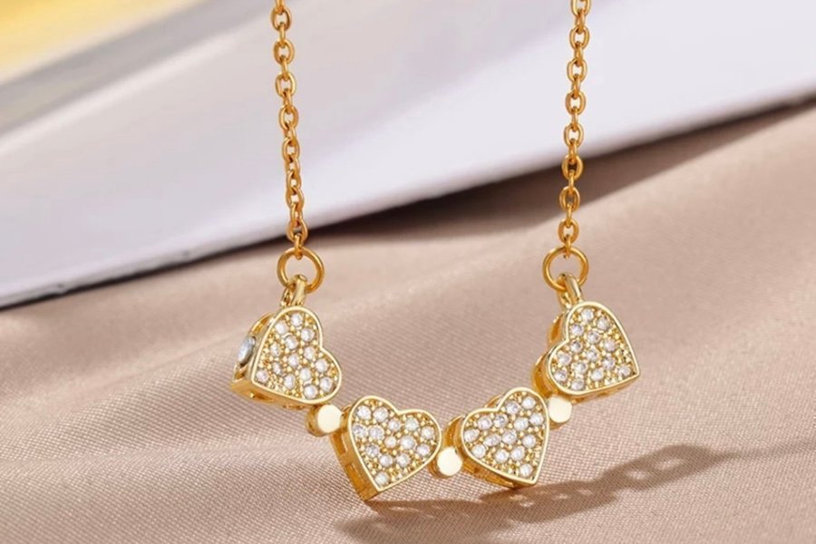 Halsband som kan bäras på två vis, som en fyrklöver eller som fyra hjärtan på rad.