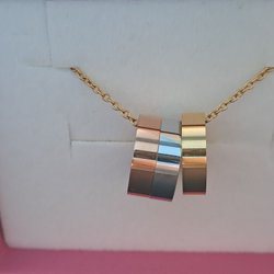 Ett set med tre halsband. Inkluderar ett långt pärlhalsband 100cm och ett kort 38cm. Båda med imiterade pärlor samt ett guldfärgat halsband bestående av två kedjor med längd 84cm