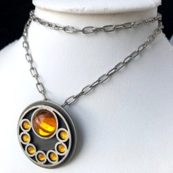 Halsband med ett hänge i form av en gul blomma. Kedjan är silverfärgad. Kedja längd 50cm. Berlocker 23mm.