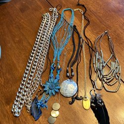 Ett halsband med ett svart hänge i form av en avlång droppe. Kedjan är av silverfärgad metall och har små kulor.
