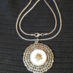 Antik inte shablon silver Halsband ( kedja) med silver hängen med bränsle sten fantastic fin arbete på silver och bränslen är ovanligt form. Båda är stämplat. Bränslen har massor av fossila i sig. Längd är på hängen 7sm., kedjan är 60sm.
