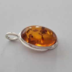 Hängsmycke med någon form av sten (bärnsten?) och med fäste i silver (925).