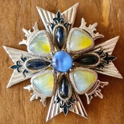 Korsformat hänge i metall med stenar på framsidan, några stenar är borta (se bild 1). Passar att hänga på till exempel ett halsband. Funkar till alla typer av stilar.