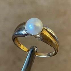 En vacker och elegant ring i 18K guld med en skimrande pärla. Ringens design är unik och detaljerad, vilket ger den en speciell karaktär. Perfekt för den som söker en tidlös och sofistikerad accessoar. Ringen väger 3.05 gram.