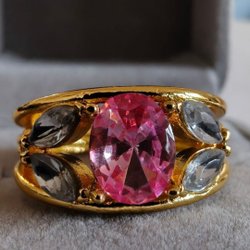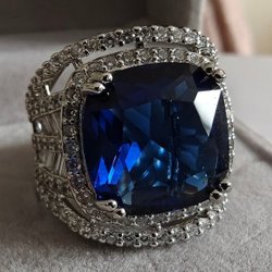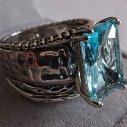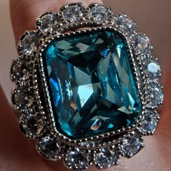 Det är som att bära en bit av himlen på fingret – en glittrande portal till både havets djup och drömmens värld. Den ljusblå kubiska zirkonian skimrar som en klar sommardag, medan de gnistrande vita stenarna runtom förvandlar varje rörelse till ett fyrverkeri av ljus. En ring som känns både magisk och tidlös, som om den bar på hemligheter från en annan värld.