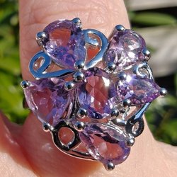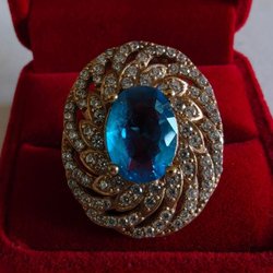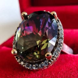 Säljer ringen "Gaia", en absolut magnifik pjäs för dig som älskar stora, tunga smycken. Med en vikt på otroliga 18,33 gram är detta en ring som verkligen känns på fingret. Designen är bred och exklusiv med en hamrad, silvrig yta som bryts av med en guldfärgad infattning runt den stora stenen.