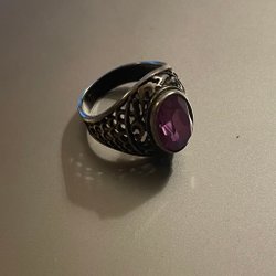 Ringen är i silver med en större bärnsten med ett dekorativt mönster runt stenen.