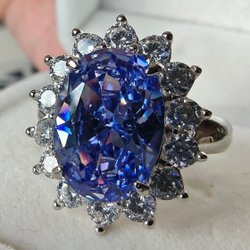 Tre stora, klara lila kubisk zirkonia i centrum, omgivna av mindre gnistrande stenar