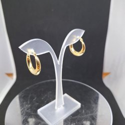 Ett par guldiga örhängen från Pilgrim. De är tillverkade av minst 75% återvunnet material.