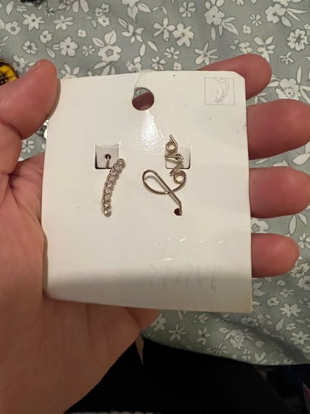 Säljer ett set med örhängen. Ett örhänge är format som ordet 'love' och det andra är en böjd rad med strass.