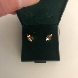 Et par øreringe i en grøn æske. Øreringene er sølvfarvede med en guldfarvet detalje og en lille sten.