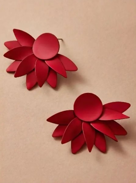 Ett par röda örhängen i form av blommor. Örhängena har en rund platta som sitter mot örat och kronblad som sticker ut från plattan.
