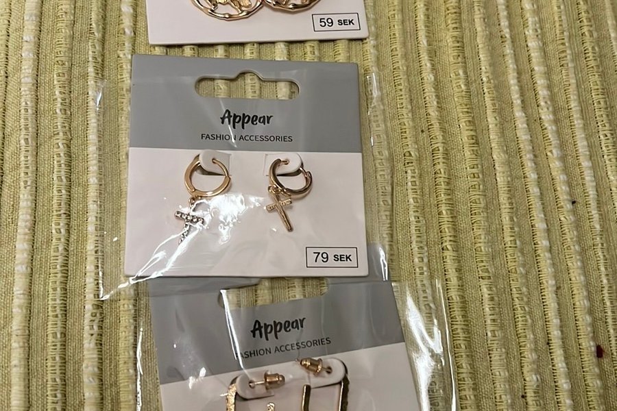 Tre par örhängen från Appear. Ett par med fjärilar, ett par med kors och ett par U-formade.