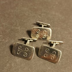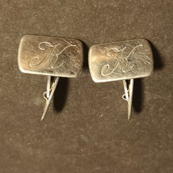 Ett par manschettknappar i guldton med en svart insats prydd med en elegant, kursiv bokstav.