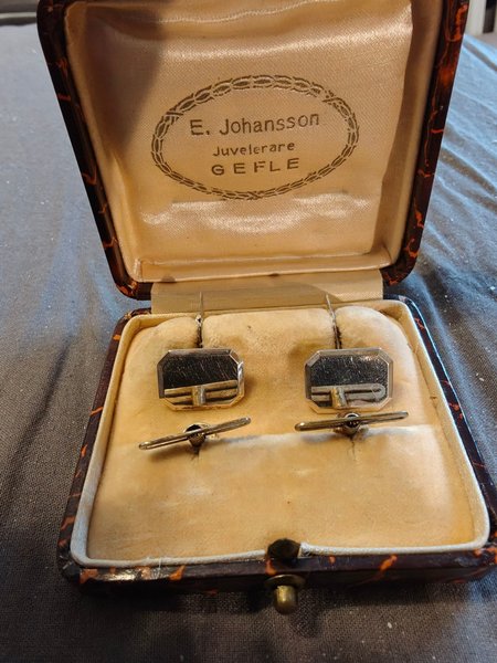 Manschettknappar i silver och små knappar till frack skjorta från den välrenommerade juveleraren och silversmeden E. Johansson i Gävle (Gefle). E. Johansson var känd för sitt högkvalitativa hantverk och bar den prestigefyllda titeln Kunglig Hovleverantör.
