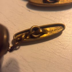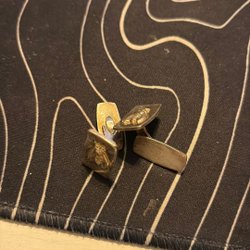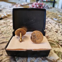 Ett par manschettknappar med en dekorativ design. De har en silverfärgad ram med ett mönster i guldfärg och en detaljerad mittsektion.