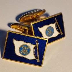 En av knapparna har ett blått emaljfält med ett stiliserat hjärta med flammande krona (ett rött hjärta med gyllene lågor/krona ovanpå – troligen inspirerat av det katolska "Sacred Heart"-motivet eller ett heraldiskt/vänskaps-/kärlekssymbol). Emaljen är cloisonné- eller champlevé-stil med fin detaljering i guld och rött.