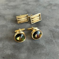 Två par manschettknappar. Ett par är rektangulära i silverfärg och det andra paret är runda med en vit emaljerad yta och guldfärgad bas. Ett par rostfritt stål