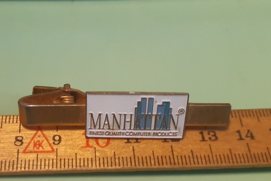 Ett slipsnål med Manhattan Finest Quality Computer Products logotyp. Den har en guldfärgad metallbas med en vit rektangel som innehåller logotypen i blått och svart.