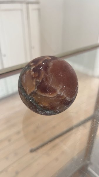 Detta är en polerad stenboll, sannolikt en agat från Madagaskar, känd för sin rika variation av färger och interna strukturer.