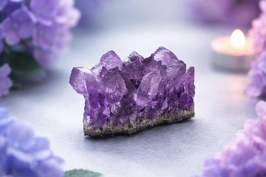 Ametist sägs skydda mot negativ energi, främja emotionell balans och stärka intuition. Den kan hjälpa dig att släppa taget om stress, förbättra sömnkvalitet och öppna för andlig insikt. Placera klustret i ditt sovrum för lugn eller i meditationsutrymmet för djupare andlig koppling.
