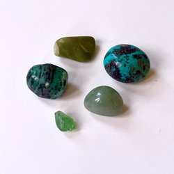 Set med fyra fina trumlade kristaller och ett miniklot: