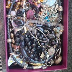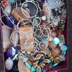 Ett antal handgjorda armband, halsband, örhängen med chips av silverplätering.