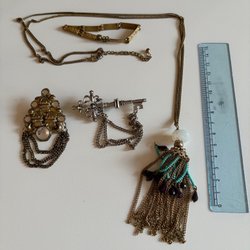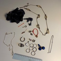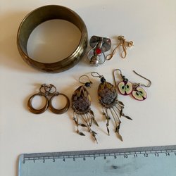 En blandning av olika smycken. Se närmare på bilderna då bla vissa stenar saknas. Inga synliga stämplar. Säljs i befintlig skick, ej rengjort. OBS! Skriver ok skick i annonsen men med reservation att vissa är trasiga.