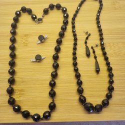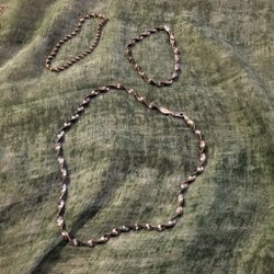 Två vackra hängen med guldfärgad kedja – ett i glas med guldmönster och ett i svart sten med silverinfattning.