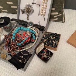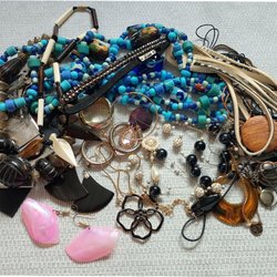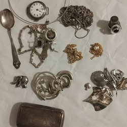 Stor blandad samling smycken och småsaker, både guld- och silver- färgade delar i många stilar, en del stämplade. Jag kan inte testa alla metaler/stenar därför säljs tillsammans som övriga. Visa smycken är oanvända i originalaskar, enstaka defekter kan förekomma på begagnade smycken. Se bilder för egen bedömning.
