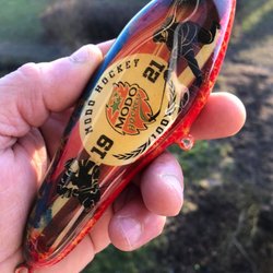 Den är gjord av EK-trä, väger ca 120 gram och är 15 cm lång. Den är bra för gäddfiske och sjunker långsamt. Säljes precis som på bilden