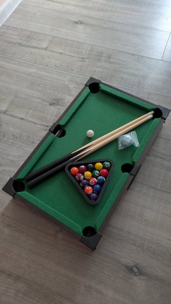 Ett litet biljardbord med tillbehör. Perfekt för barn eller som ett roligt spel för vuxna.