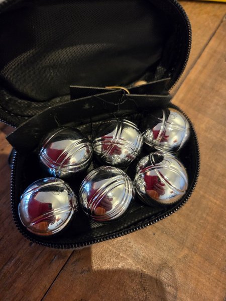 Petanque set med sex klot i silverfärg. Kloten har ett mönster av inristade linjer. Setet levereras i ett svart fodral med dragkedja.