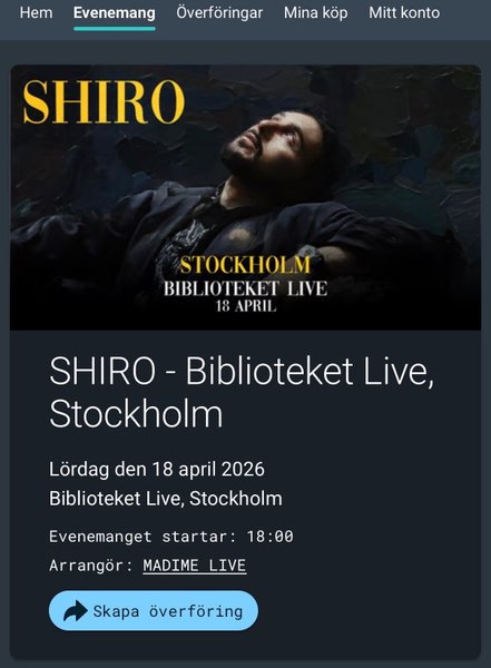 Säljer två biljetter till Shiros konsert den 18/4-2026 i Stockholm. Har tyvärr fått förhinder. Båda säljs tillsammans, inte enskilt. Dem skickas till ditt tickster konto efter betalning.