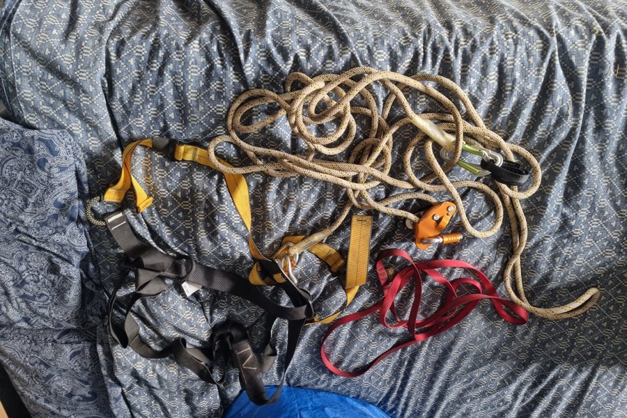 Fallskydsutrustning bestående av en klättersele, ett klätterrep och en repbroms. Selen är i färgerna svart och gul. Repet är beigefärgat med gula inslag. Repbromsen är orange.