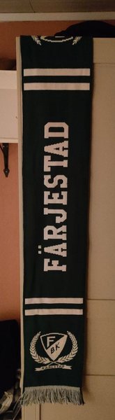 En halsduk i mörkgrön färg med vita ränder i vardera ände. Mitt på halsduken står texten "FÄRJESTAD" i stora vita bokstäver. I ena änden finns en logotyp med bokstäverna "FBK" omgivna av en lagerkrans och texten "KARLSTAD" undertill. Halsduken har fransar i båda ändar.
