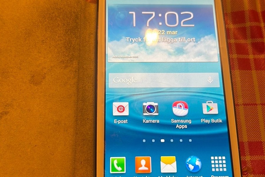 Samsung Galaxy S3. Telefonen har en skärm som visar "17:02" och "22 mar". På skärmen syns ikoner för E-post, Kamera, Samsung Apps, Play Butik, Telefon, Kontakter, Meddelanden, Internet och Program.