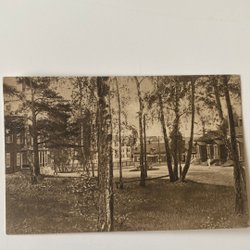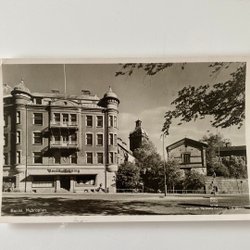 Svartvitt vykort föreställande Uddevalla, Västerlånggatan. Vykortet visar en gatuscen med byggnader, bilar och människor. I förgrunden syns en gräsyta med ett staket.