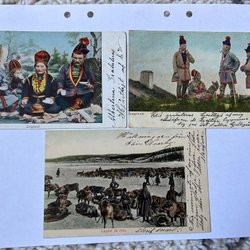Tre vykort med motiv från Hassela. Motiven inkluderar en översiktsbild över Hassela, Hassela kyrka och Lotsgården i Hassela.
