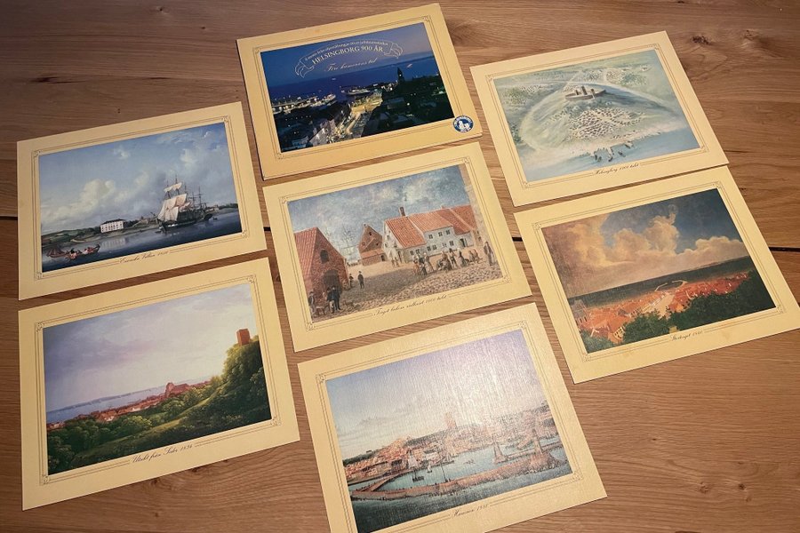 Sex tryck från oljemålningar över jubileumstaden Helsingborg 900 år. Motiven inkluderar Helsingborg 1300-talet, Stortorget 1840, Hamnen 1880, Torget bakom rådhuset 1800-talet, Utsikt från Söder 1834 och Esvenska Villan 1850. Bildstorlek, 25x32 cm.
