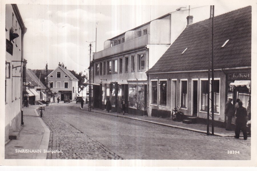 Ett svartvitt fotografi som visar Storgatan i Simrishamn. Byggnader kantar gatan, och flera personer syns längs trottoarerna. Gatan är belagd med kullersten.