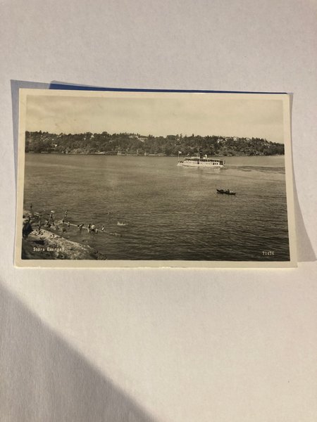 Ett svartvitt vykort föreställande Stora Essingen med en båt på vattnet.