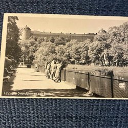Vykort med motiv av Uppsala. Framsidan visar en panoramavy över staden med Uppsala slott och domkyrkan i bakgrunden. Text på framsidan beskriver motivet på svenska, engelska och franska. Baksidan är tom med undantag för en stämpel "EXTRA PRIMA Fotograf" och texten "Svensk tillverkning 42708" samt ett handskrivet nummer "65306".