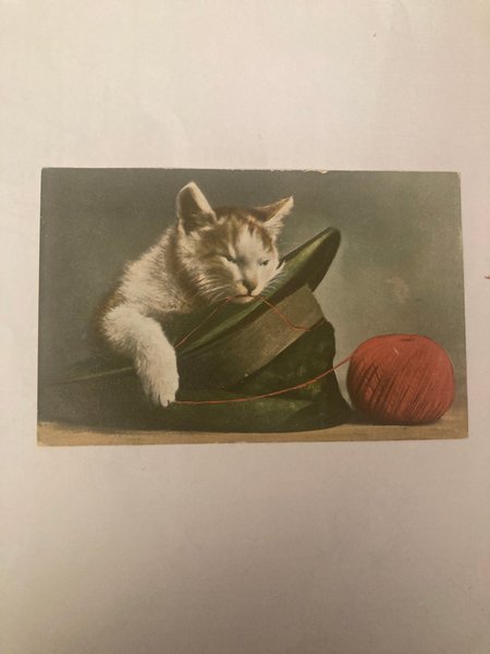 Ett vykort med en kattunge i en hatt och ett garnnystan.