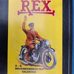 Ett vykort med motiv av en man på en motorcykel. Vykortet har en gul bakgrund och texten "REX" i rött. På baksidan finns plats för adress och meddelande.
