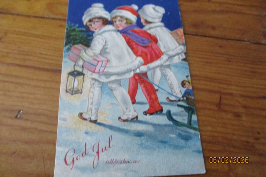 Ett julkort med motiv av barn i vinterlandskap med texten "God Jul