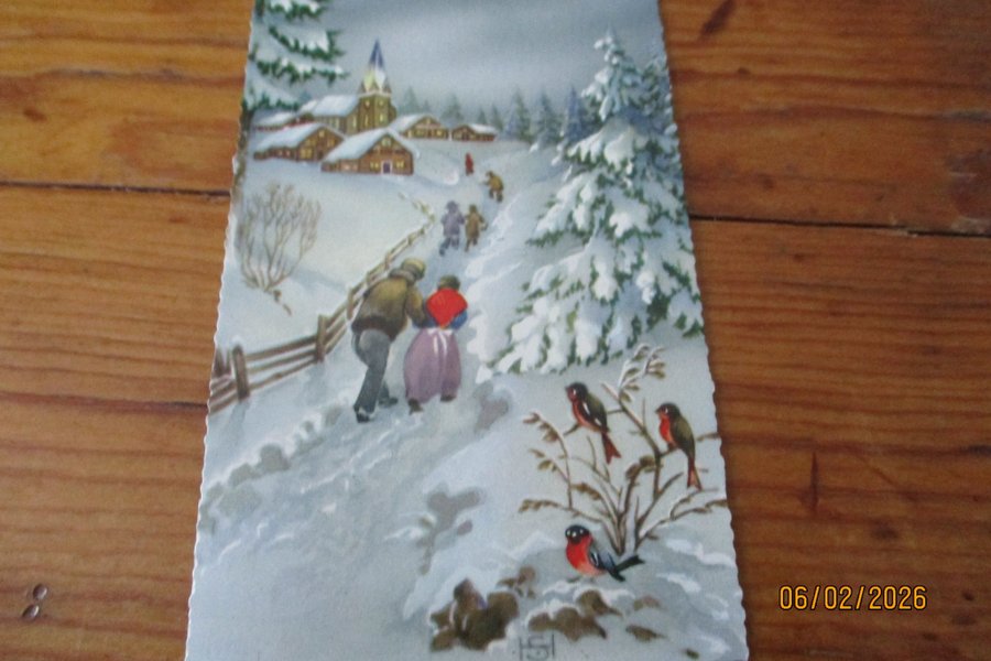 Ett vykort med ett vintermotiv. På bilden syns ett snöigt landskap med människor och