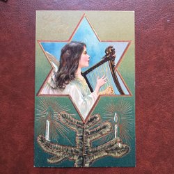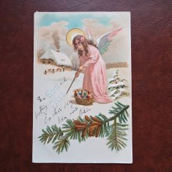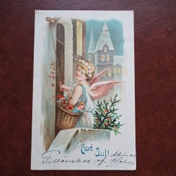 Ett vykort med julmotiv. På kortet syns en julklocka, fåglar och texten 'God Jul'. Köparen betalar frakten .