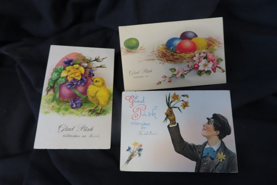 Tre påskkort med olika motiv. Ett kort visar färgade ägg i ett bo med blommor. Ett annat kort har en kyckling, ett ägg och blommor. Det tredje kortet föreställer en person som håller i påskliljor.